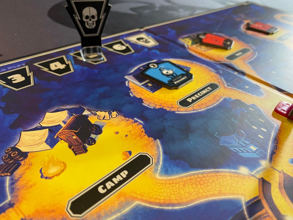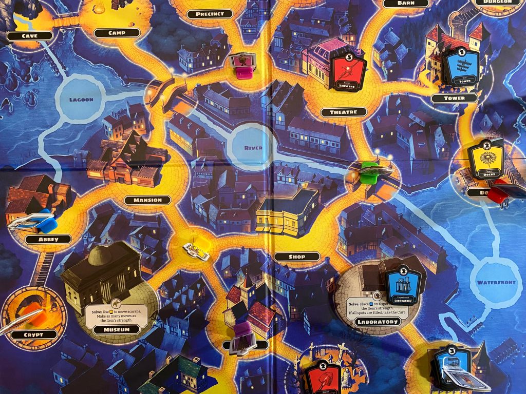 The game board itself is also very bright and vivid. You can easily see locations and the spots are big enough to easily hold the various minis/standees/tokens that will be filling them. It does take a bit of memorization starting out to find locations for item tokens but since players will be plopping these babes down at the end of each turn, it very quickly becomes second nature to know exactly where they go.
