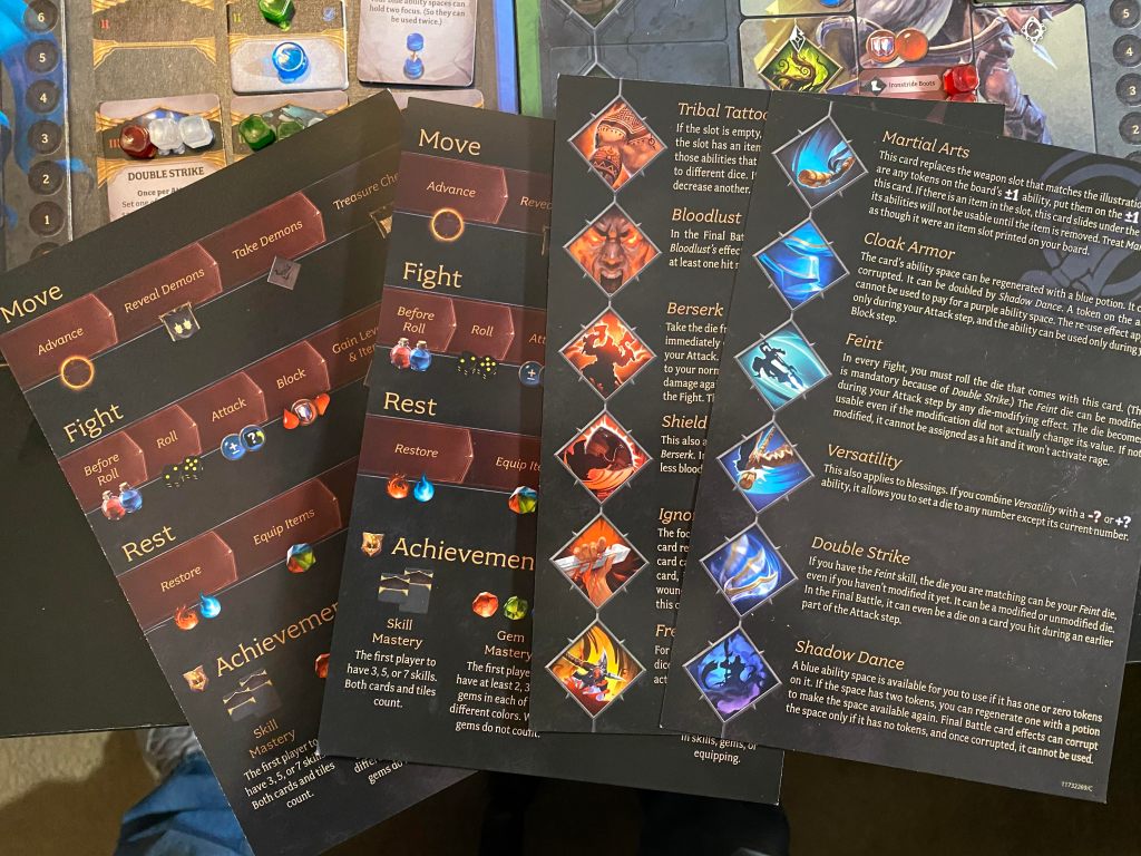 The first thing that happens is you will take damage based on how many of those pesky blood droplets are showing on cards that have not been defeated. There are two drops on each showing card and a random value on each hidden card (although if the cards are still flipped and hidden you don’t take that damage). You, of course, can defend using your stamina/focus abilities. Then you will flip over a couple of those hidden cards from the deck and resolve both cards one at a time. These basically just hinder your fight even further and make it more challenging for you. After that, you collect your dice used during the last round and start again trying to make it as far as you can. Players HAVE to get all the way to the end of their respective cards and beat the last one if they have any hope of winning. The player who not only beats all the cards AND has the most total life remaining is declared the victor! But honestly, if you even survive the fight by beating the demon lord, give yourself a pat on the back cuz this beast is TOUGH!