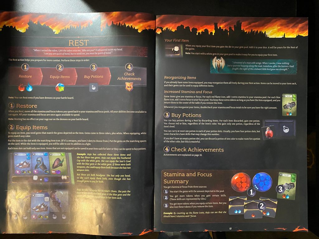 The second reward you get for destroying a demon is that sweet, sweet loot! You will take the demon card you just vanquished and flip it and on the opposing side you will find your random loot drop! You then place this delicious loot in the bag space on your player board, collecting more and more loot as you go on. Which then brings us to the last action, Resting. When you rest you can move any spent stamina and focus tokens off spaces on your board back to the general pools to be used again in future battles. But, more importantly, you can equip all that succulent loot that you have been collecting IF you have the required gems! You see, each piece of loot requires at least one particular color of gem to be equipped which you do know in advance based on the color of the demon card, (eg. a green demon card will have green gems to move and green gems to equip.) Once you get all the loot equipped to your hearts desire (which opens new and exciting dice mitigation abilities) you can then choose to sell off any old loot you no longer want or need for potions. Potions allow players to remove focus or stamina tokens back to their general pools BEFORE they roll for battle. These can be very useful for continuing to move, collect and fighting while not having to rest as much but you can only hold four potions total.