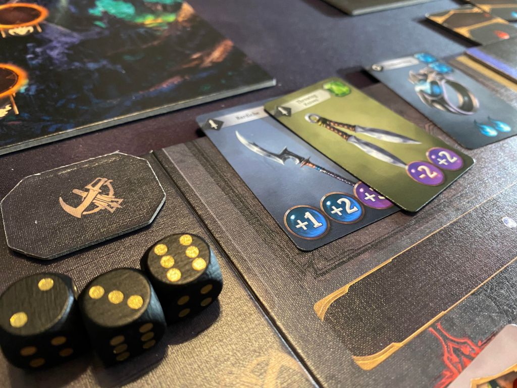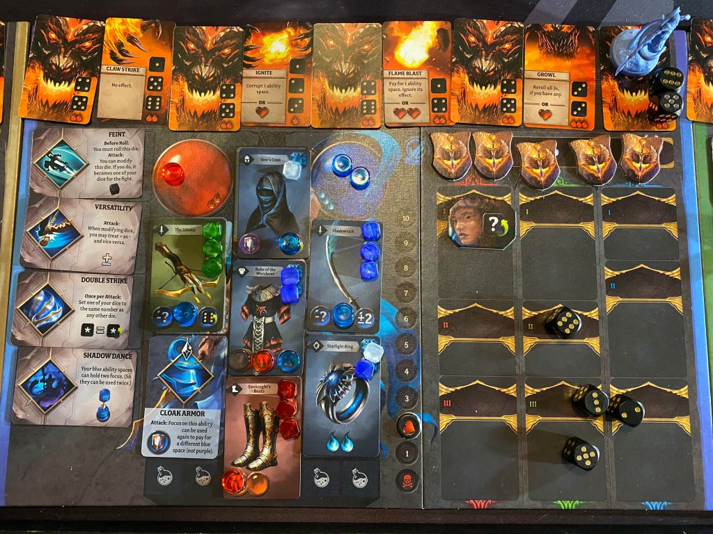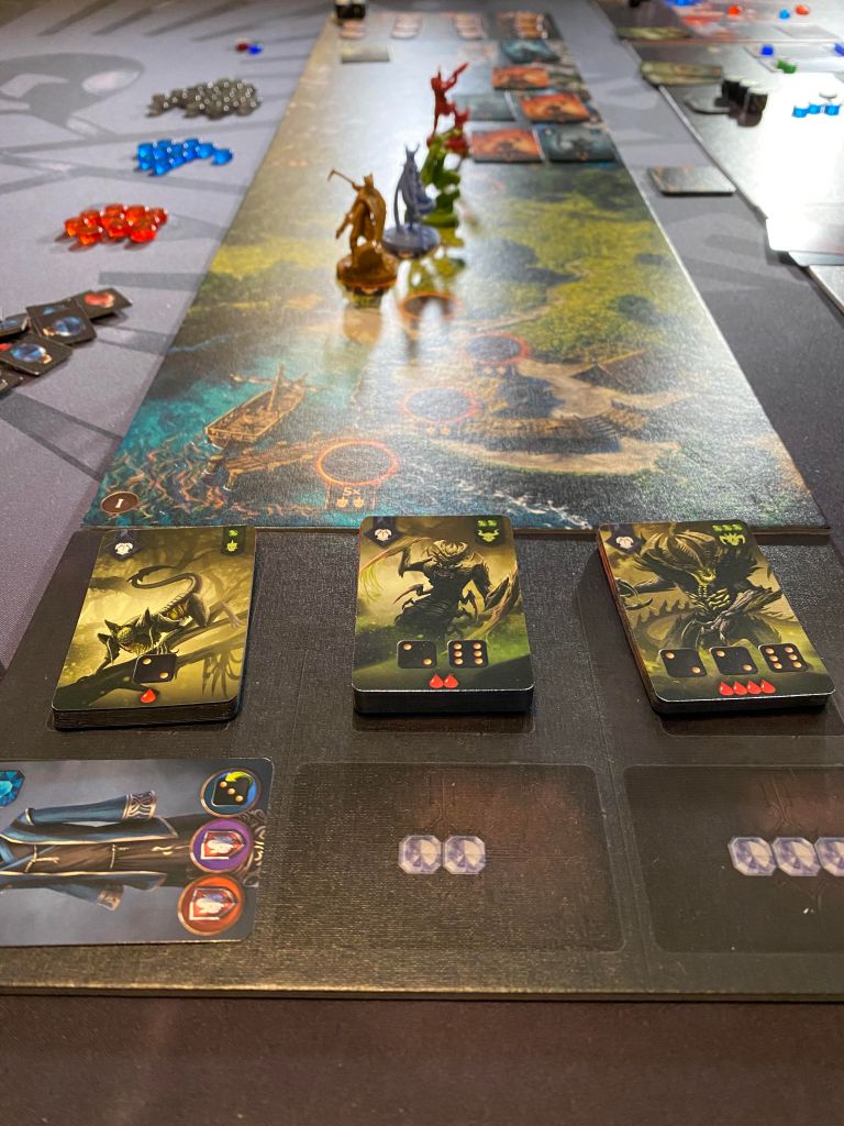 I can tell you right from the start that I have had a blast playing this. The way the dice rolling fighting works with the leveling up and looting is SO addicting. This is one of those rare games that after I spent almost two hours playing the first game, I wanted to reset it and play it again. There isn’t any exploration as the board just always moves you forward on the exact same path every time but the loot will always be different and as such the way you can mitigate those dice. And each character is different as well so that just adds to the fun of it all.