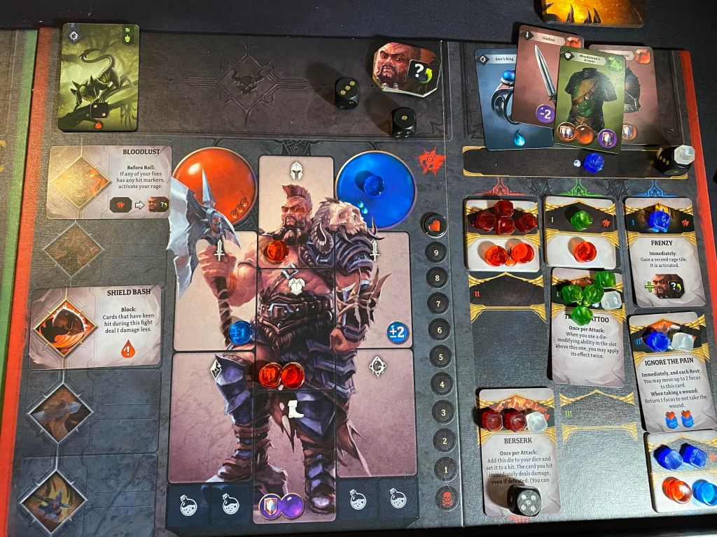 The next action is the fight action. If you already have some demon cards on your player board you can opt to fight them instead of moving and collecting more. To do this you will roll your dice that you have acquired (player start with just two dice but can eventually get up to six including their special die). You then match up any of your rolls with the indicated dice value on each demon card. If you don’t roll what you need you can mitigate those rolls by altering their face using your loot cards or your basic player board. For example, each players starting board starts with the same mitigation aspects. Your left arm space has a “change one die + or – 1” and your right arm has “change one die + or – 2”. You would simply move one of your “focus” tokens to cover the particular space you want to use and voila! You can change the die to that sum. Also, each player has a rage token they can use once to change one day to any face. These rage tokens refresh if you ever have any left-over dice that you cannot use and enemies that are still alive on your board. After placing your dice on demon cards to wound them, if you are able to cover each dice symbol needed on a demon card, you destroy the demon! If not, then the demon will attack you and hit you for the value of blood drops on its card. In that case you will try to defend against that attack by manipulating your “Stamina” tokens much in the same way you did with your “Focus” tokens on your board. For any hits you could not defend against, you will lose that much health. Now, health is SUPER precious as it is your sole deciding factor if you win or lose this game, so you want to protect it with everything you have.