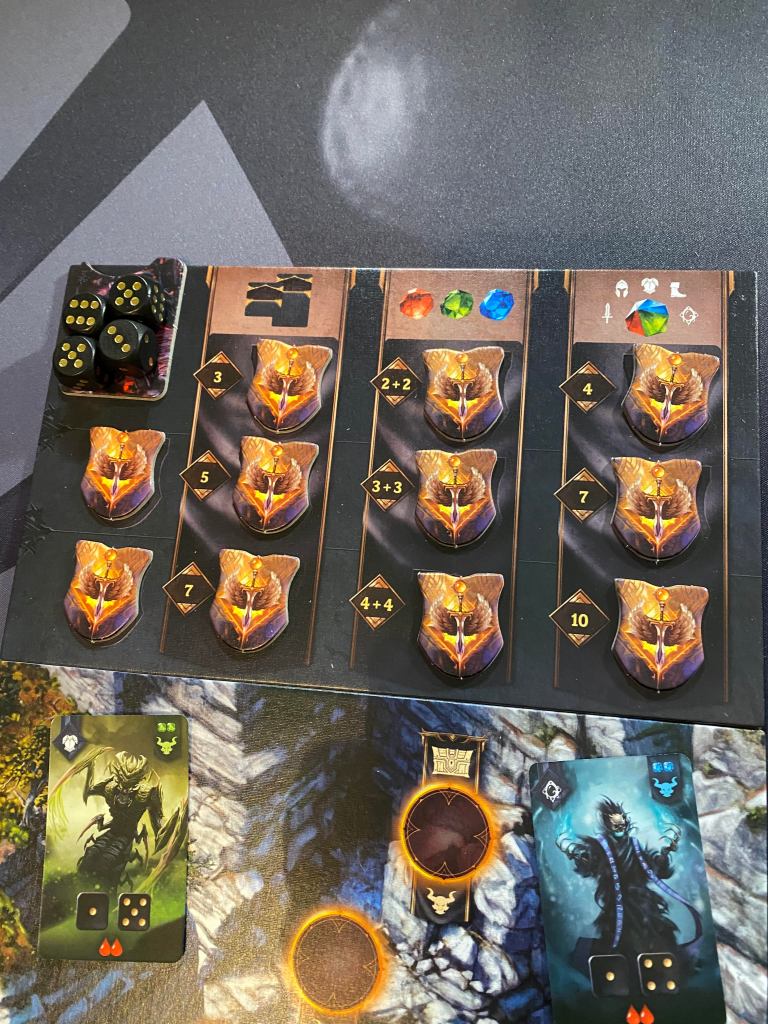The dice are pretty meh however, I mean, don’t get me wrong I think they work just fine for general play but I have personally already ordered some more “thematic” acrylic red and black volcano speckled dice to replace them. For a game where you will be rolling dice almost every moment you only want the best. The dice included are smaller than regular size (which is fine) and made of a very light weight wood with golden pips on most of them and silver pips on four of them. The silver pipped dice are meant to represent each character’s special ability that unlocks another die. Although during play I found that the silver and gold are SUPER hard to differentiate and honestly, didn’t really matter. You could use any die in the silvers place and it works the same with the only difference being when you use the die. Now, all that said, I normally don’t order “upgrades” to my games UNLESS I REALLY like the game so keep that in mind.