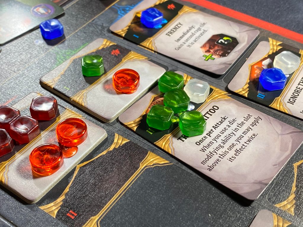 On the other hand, for all the demons you were able to destroy you get two rewards! First is that you can manipulate the particular listed gems that are shown on the demon card. These gems are basically the leveling up/skill tree system the game has going on. On each player board the entire right-hand section has cards and tiles that have new abilities to unlock and more stamina and focus tokens to add to your pools. Demons are of three different gem types/colors, Green, Blue and Red. So, for example when you destroy a green demon that shows two green gems on its card, you get to move two green gems UP on your skill cards section. Once all the gems are moved off one of the skill cards/tiles, you get to collect that new skill and add it to your ever-growing repertoire. There are also white gems that act as “wilds” and can be moved instead of any other color. Now, if you ever move any of those luscious gems up off the top most card/tile they are then in your gem holding bag ready to be used to equip collected loot.