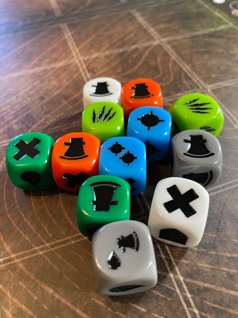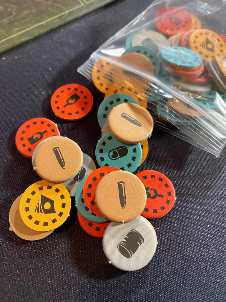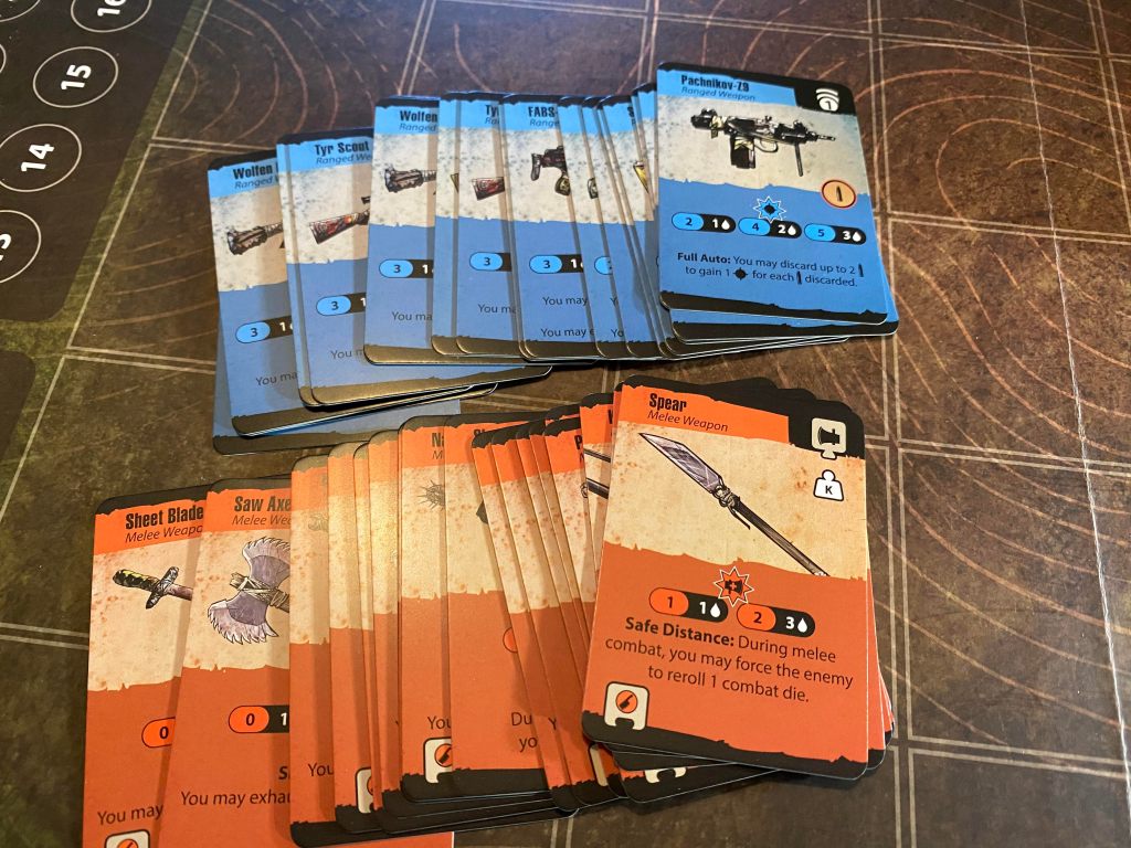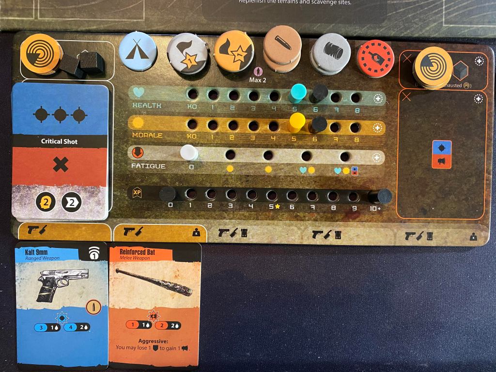 To be honest I was expecting a bit more in the components department, especially considering I went in for the “Deluxe” edition. The quality of the components is pretty good overall BUT there are just some head scratching decisions with them. The biggest complaint I have are the deluxe resource tokens. In the deluxe version they have been upgraded to small plastic representations of the items. So instead of round cardboard tokens with a picture of a bullet you now have a small plastic pair of bullets or little half cans of food etc. These LOOK really cool don’t get me wrong but they are a BEAST to actually use when playing the game. First off, they are tiny AND have rounded edges so good look picking these things up without making a mess of everything in the attempt. Secondly, they just don’t work with the player board at all. The player boards have small rounded areas dedicated for the resource tokens ie: the basic cardboard ones. So, when using the retail tokens this works out great! But try stacking a couple of those plastic cans of food on top of each other. You will very quickly have a pile of plastic tokens scattered around your player boards and for those players that like to keep a neat area, this is just ugh. LUCKILY, the deluxe version does come with the basic cardboard pieces as well!