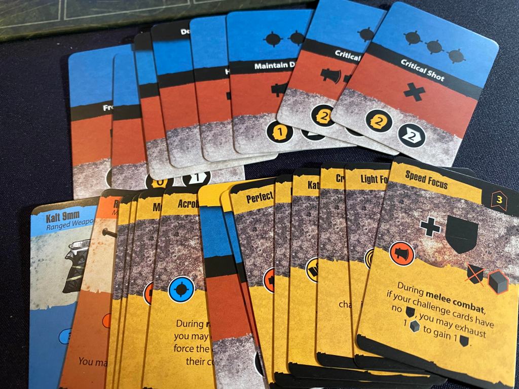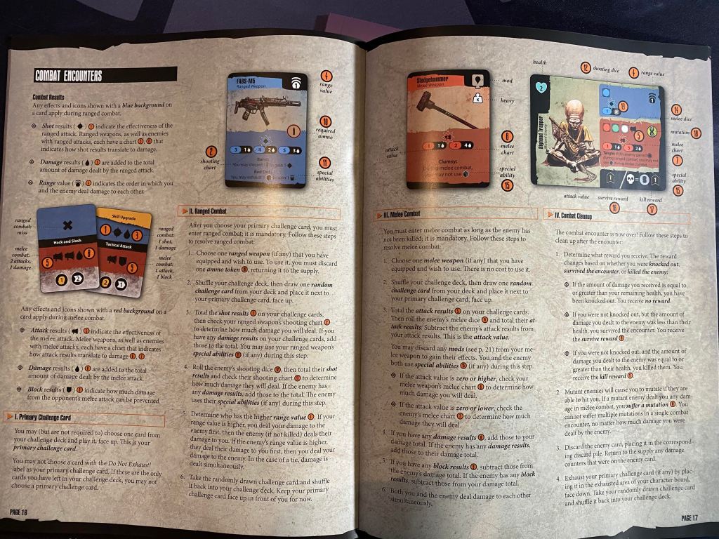 Also learning the combat was a CHORE. This is my biggest complaint to be honest, even though there is a full 2-page spread explaining it. The combat in this game is excessive to say the least, overly complicated which just kills the fun for me. When you resolve a combat encounter you first have to pick a card from your remaining challenge cards to use as your base card. THEN, you randomly draw another to see if you got enough of a certain ranged icon to damage based on your used weapon….which is a whole other story. Then you mix that card back in and draw again for the melee attack and the combat changes rules during this portion of the fight. Each enemy will roll different dice against you and possibly make you draw a mutation card (which coincidentally I really love that part). After it’s all said and done you discard the card you picked as your base and shuffled the rest back in so your challenge deck is always getting smaller. Now, I should say that I like some of the mechanisms used here such as the way your combat deck is utilized, although I don’t much care for the constant shuffling. I really don’t like the melee portion with the way the dice work, it’s just TOO much. Personally, I think combat should either be ranged OR melee, not both at the same time.