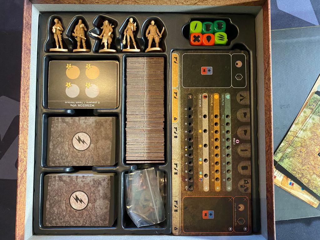 The box storage solution is pretty good with the base game! It has a good insert which has dedicated spaces for ALL the cards including the mini sized versions. There are spaces for the minis and open areas to place the tokens within bags and spots to place the player boards snugly. Everything fits in pretty nicely…..unless you try to add in the deluxe stuff as well. I had some trouble placing the two bags of story and scavenger tokens back in the box with everything else although the deluxe version does come with another smaller box to hold that stuff.