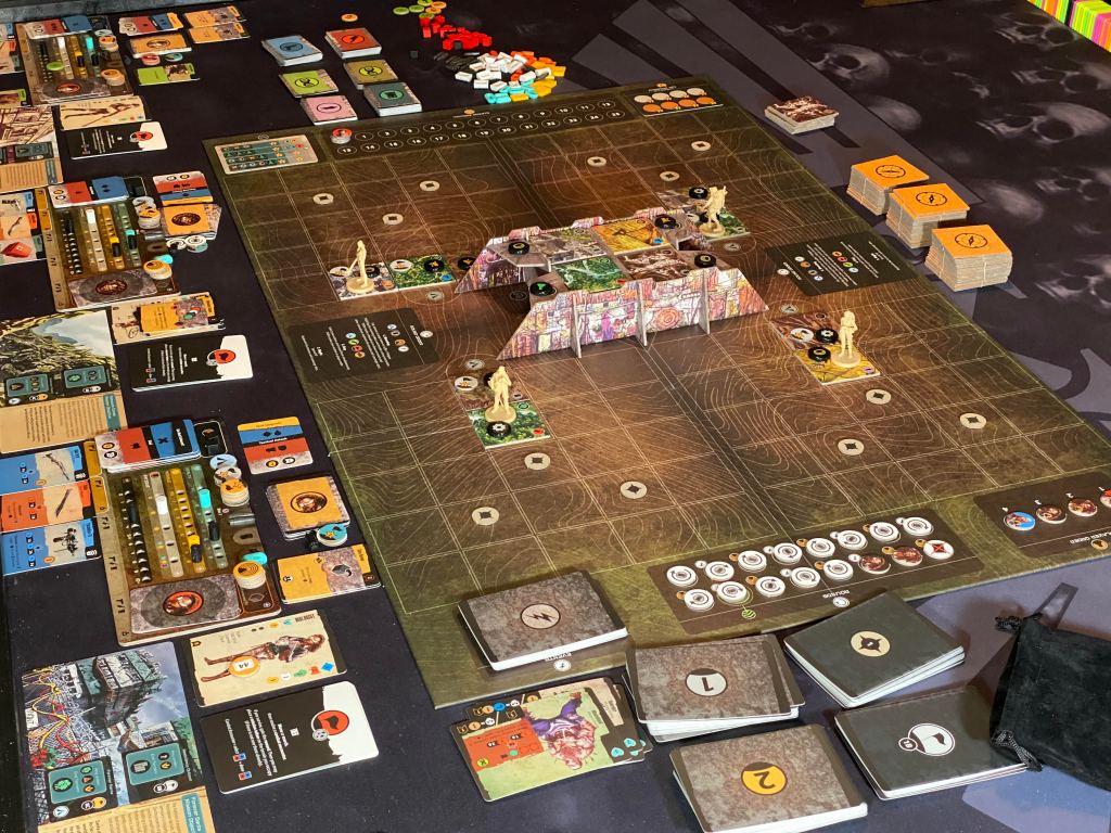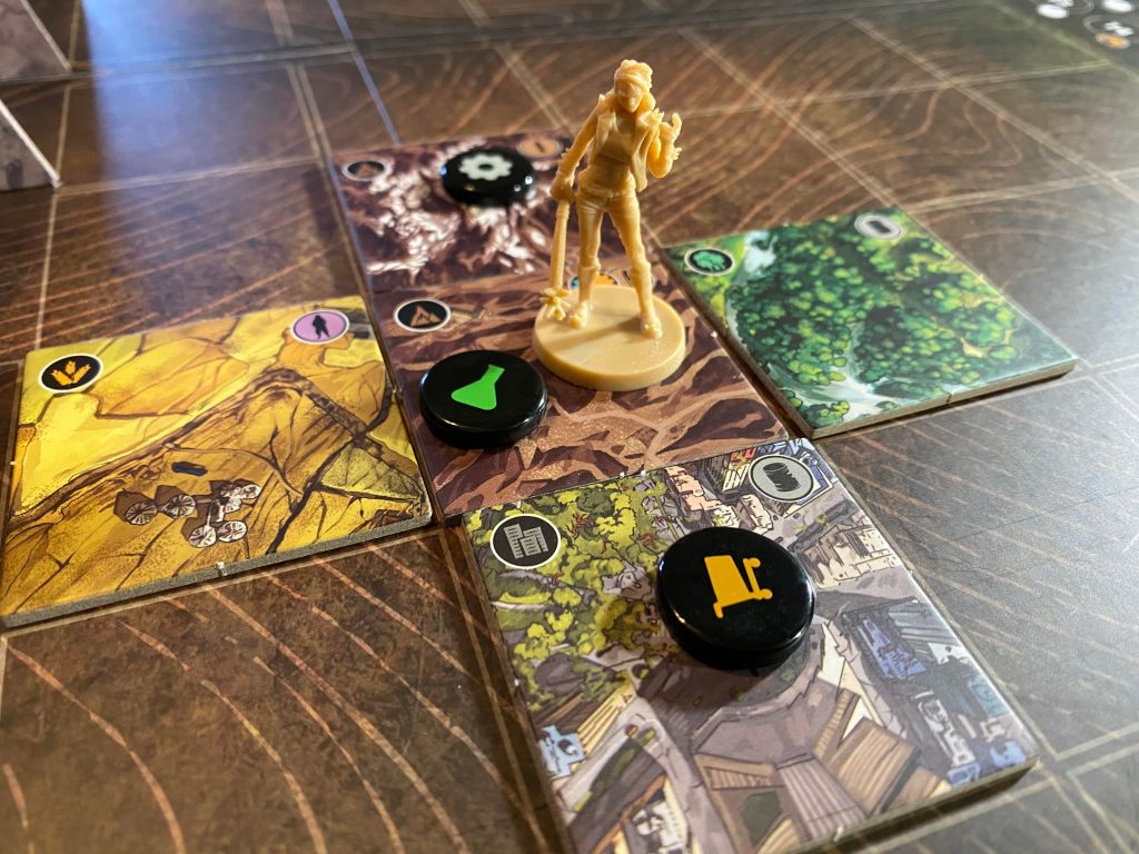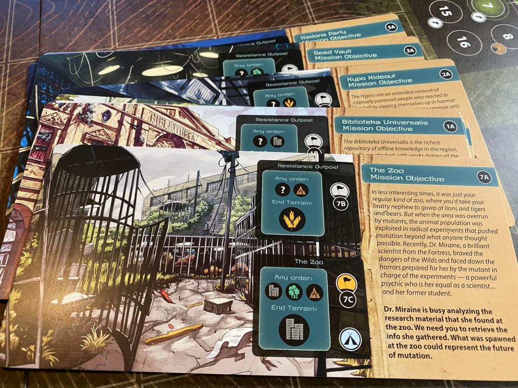 After all players have completed all their actions the night phase trots on up where players can spend the experience they have earned through their battles. You also refresh the map queue plopping down some new location tiles and scavenger tokens for the next round. After that the rounds start anew! This will continue until a player has worked their way through all their mission objectives and encountered and defeated the mutant boss. That will trigger the end of the game once the round is over OR if this hasn’t happened by the end of round 16 the game will end then. There is a bit of a final scoring to be done on top of what players have already scored through the regular gameplay and then whoever has the most VP’s wins the game!