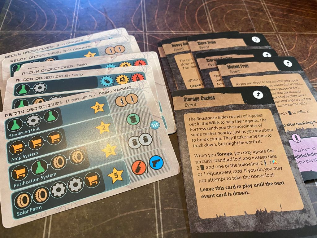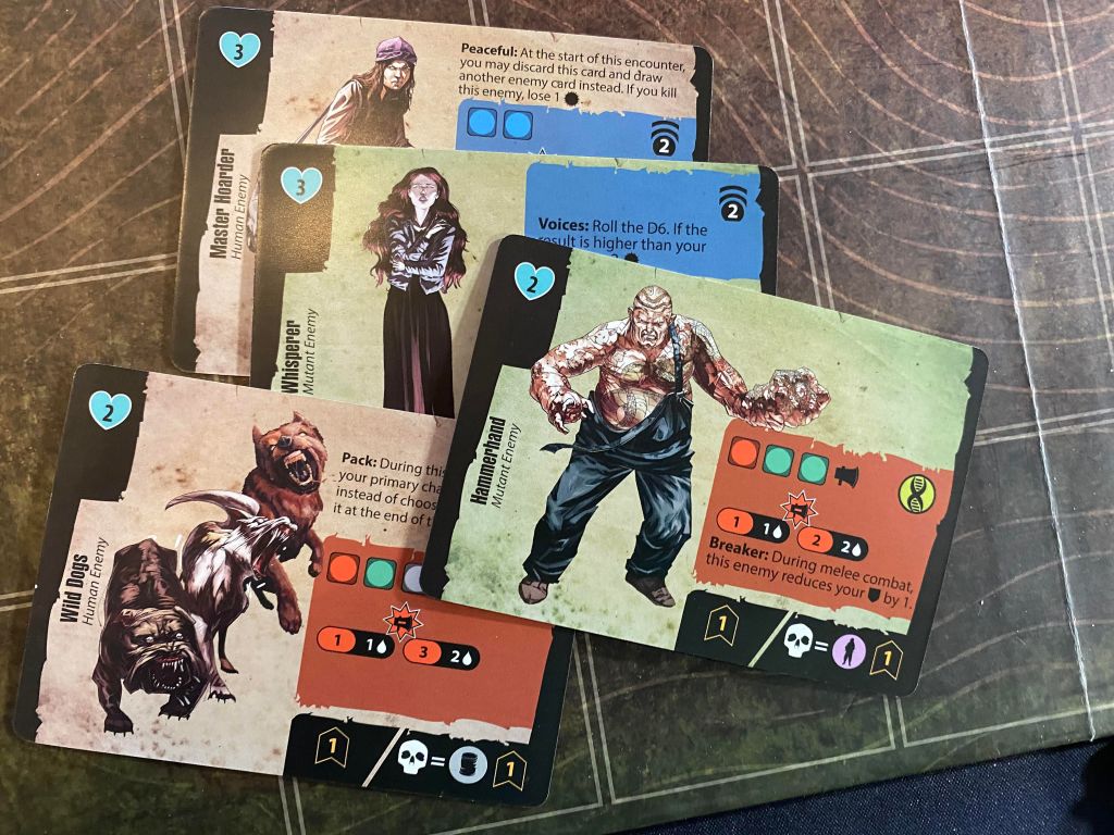 That said, I had quite a bit of fun playing the game! There is a dedicated solo mode you can partake in that is super tough to beat, but it’s fun! The game plays more like a race/puzzle to solve than an overly thematic survival game. Players are basically trying to find the most efficient and quickest way to complete their missions because the first player that completes each mission gets a bigger chunk of victory points. The tiles you lay don’t really mean anything other than a means to an end since you are trying to complete combat encounters on specific tiles in a specific order. The typical gameplay is ok but where the game REALLY shines is through its story encounters. These are random snips of wasteland encounters that players will have as the game rounds progress giving them options and choice to make, some ending badly, others good. They are very well written and provide a nice break from the race/puzzle of the regular gameplay.