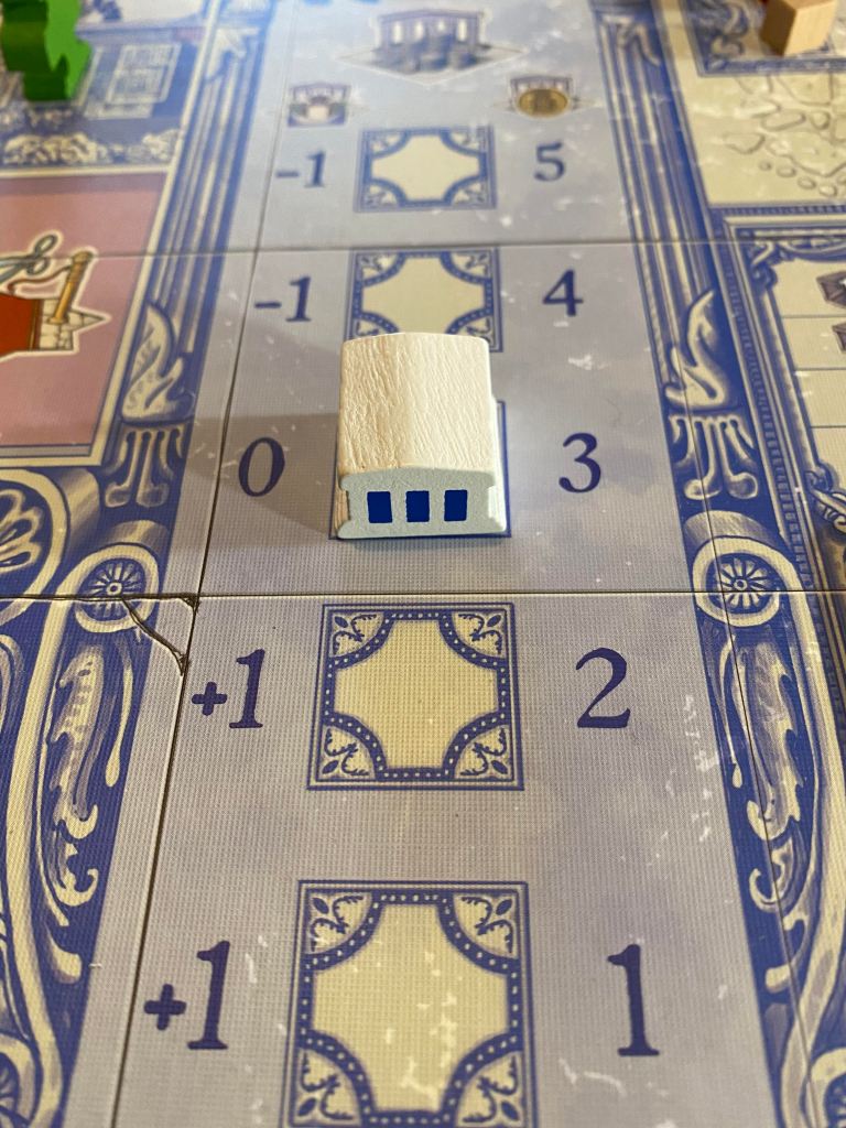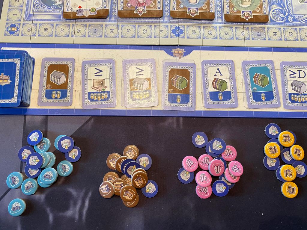 As such I have a pretty good time playing. Let me tell you though this is not one of those games you are gonna just pull out and have a nice hour game and run along. This game takes a lot of thought and time to play effectively. The setup will take a bit and even then once you start to play for the first time you will just sit there in a stupor on what you should even try to do first. This game is not for the squeamish and the first few games WILL be strenuous for all players involved. There will be lots of looking through the player aids and then the manual to confirm the small parts. You might find yourself getting all the way through building a store only to realize you don’t have enough money or need to build somewhere else. The public building and store scoring scheme particularly took me awhile to get straight and then once you finally grasp it, trying to plot out a strategy on exactly HOW to place those individual pieces to maximize your points is mind numbing.