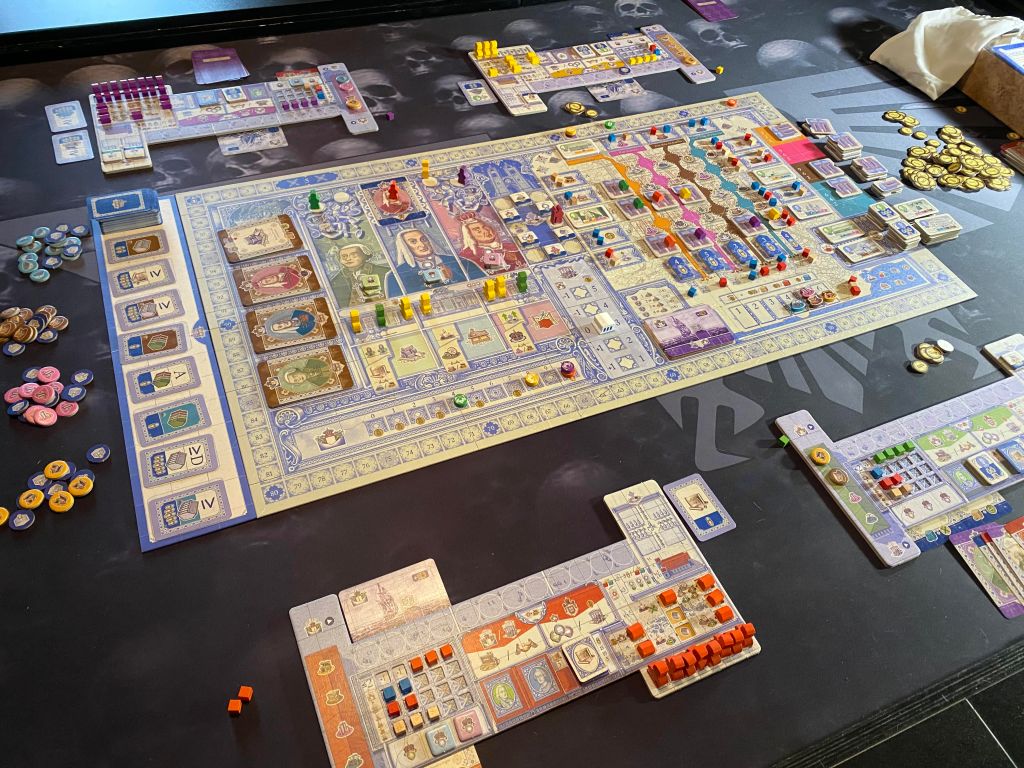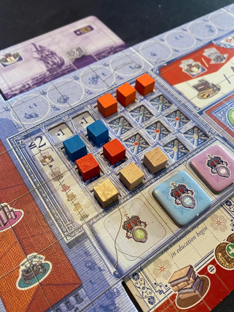 The player interaction is one of those where you will be competing with other players for those delicious cards and spaces to build in the city. As such the interaction is mostly indirect and it’s all first come, first served. Now, you can utilize other players ships they bought to sell your goods, making you money….BUT doing so only goes to help THEM get those precious VP’s (oh yeah, in this game they call VP’s “wigs”, which is again thematic). Placing stores and public buildings are also tricky because you could accidentally supply other players with VP’s as well if you’re not careful based on their building locations. You can also see this in the Noble’s offices with the amount of official meeples other players have visiting. The more meeples other players have, the higher the cost of influence when you follow an action. So, you are never really directly attacking players BUT there are SO MANY ways to indirectly affect them.
