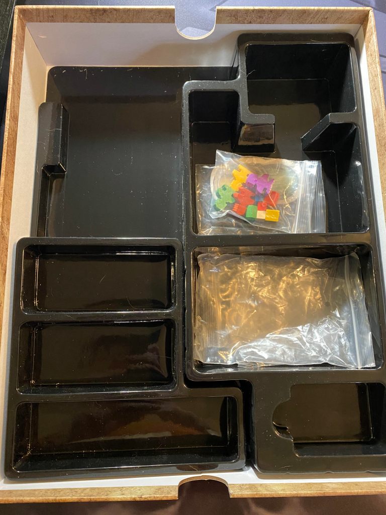 The box is rather large but fits perfectly fine in a standard Kallax shelf, it also looks really nice with an old style stone motif. The insert is great overall with a clever use for the separate inserts that hold the player pieces. On the very bottom of the insert you place the large player boards and then on top of those sit the two removable inserts that hold the four sets of player tokens. There are also other storage sections to hold the rest of the components but these are kind of up to the player on how they want to store everything. The spots that hold the cards are nice as well with easy access to them. There is a lid that sits atop everything to make sure nothing goes spilling out when tilted. I can say it works pretty good save for a few of the smaller cards tended to escape but those were easy to sort.