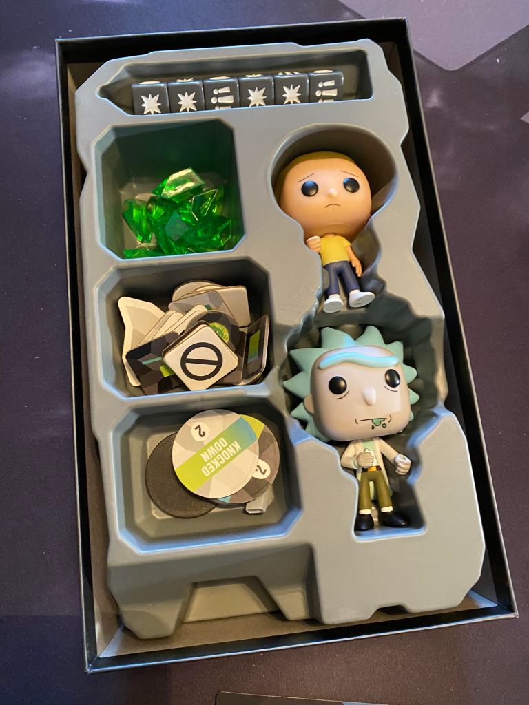OH! And my absolute favorite part are the little plastic point tokens. These things are awesome looking little translucent crystals which really have no business being as cool as they are considering they are just used to track points. What’s even better is that every different addition to buy for this game includes more but in a different color. Blue for the Batman set, green for the Rick and Morty set etc. The Pop figures are all very colorful and can each hold items in their hands easily. Interchanging the items is right up there with the cool features. Having Rick utilize Harley Quinn’s mallet or Morty using Batman’s batarang is a nice fun twist to the game.