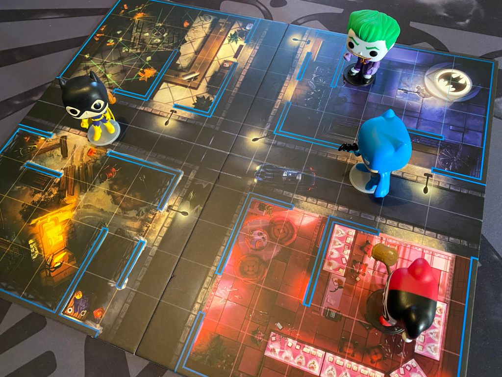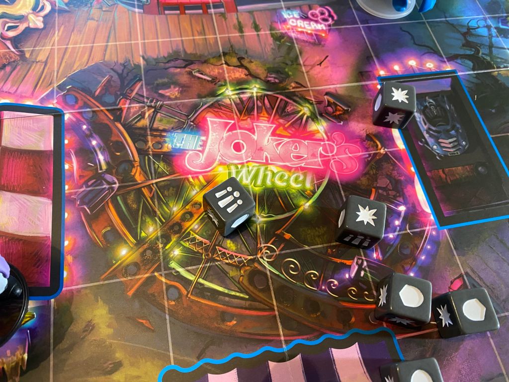 The components are really nice and my favorite thing about the game. The Pop figures are a tad smaller than their usual counterparts and come with little bases so they stand up easily. The dice in the game are very nice custom dice that have a nice feel and weight to them. Even the cardboard tokens feel and look nice. The board itself is on the smaller side when compared to most board games and is double sided so you have a couple choices of movement options as areas are blocked off differently on each, but more than that they have a completely different theme from one another. One side of the Batman board is The Jokers carnival area which is extremely colorful and just flat out fun looking. The other side is Gotham City itself at an intersection with each corner of the board being the interior of a building.