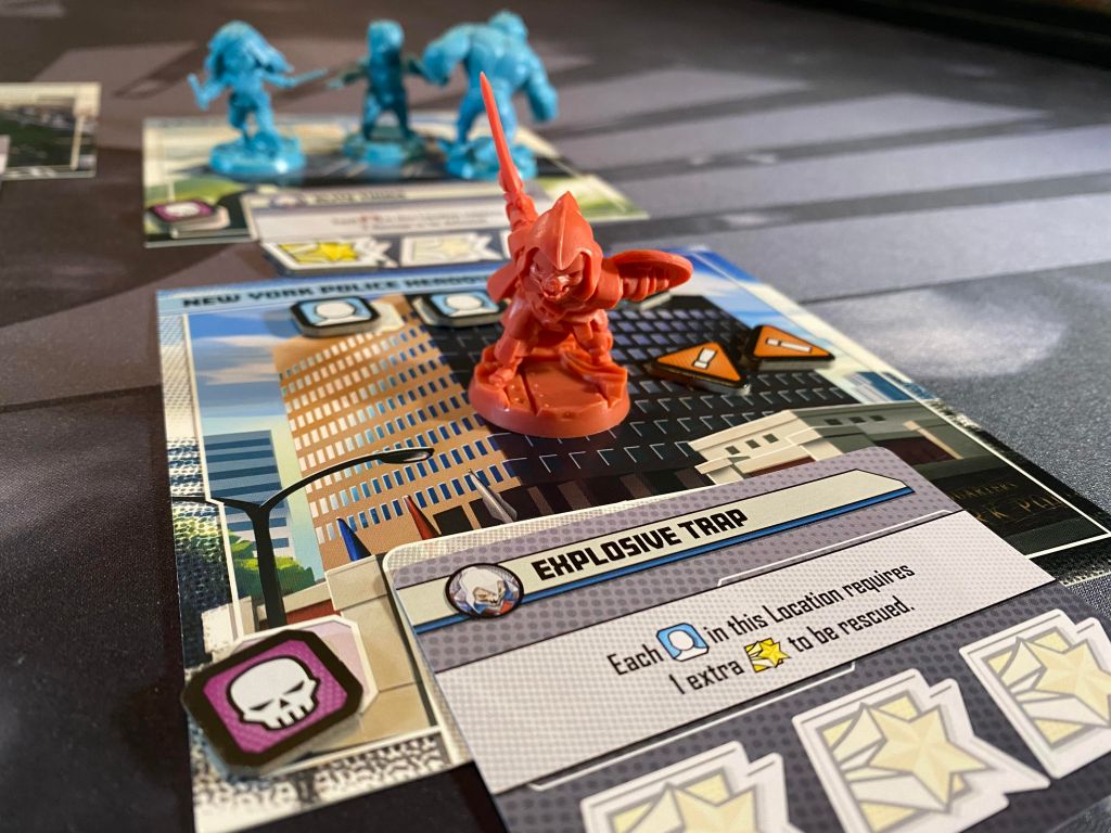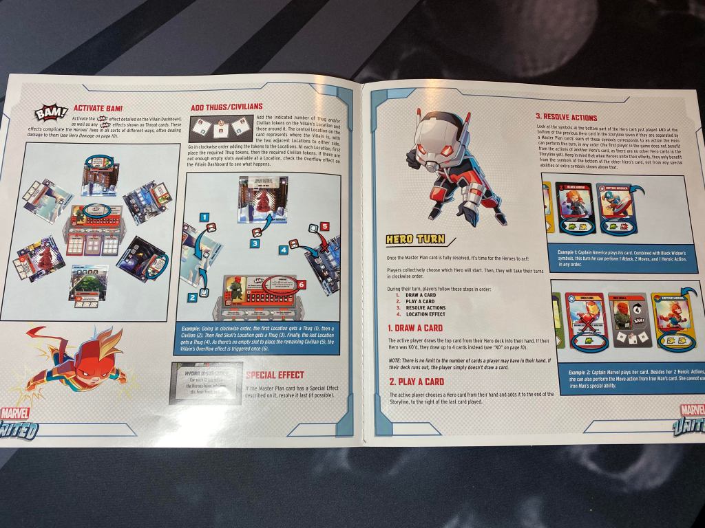 The components are ok. The miniatures are by far the best thing about the game, very detailed and just flat out fun. I especially like the Ant-Man miniature as he is perched on top of a quarter, each mini is bulky in line with the art style they went with so they feel sturdy and premium. As far as everything else, the cardboard tokens are pretty standard quality and the cards are nothing fancy. My biggest complaints with the components are the location cards and the mission guide. The mission guide is especially thing and it forms the centerpiece to the entire play area. You will be staging the villain dashboard (which is just as thin) on this as well as the three goal cards you are meant to complete. This mission guide has already warped so it doesn’t lay flat which just throws off all the other thin card materials that sit on it.