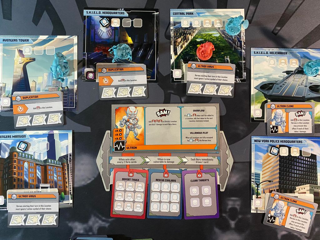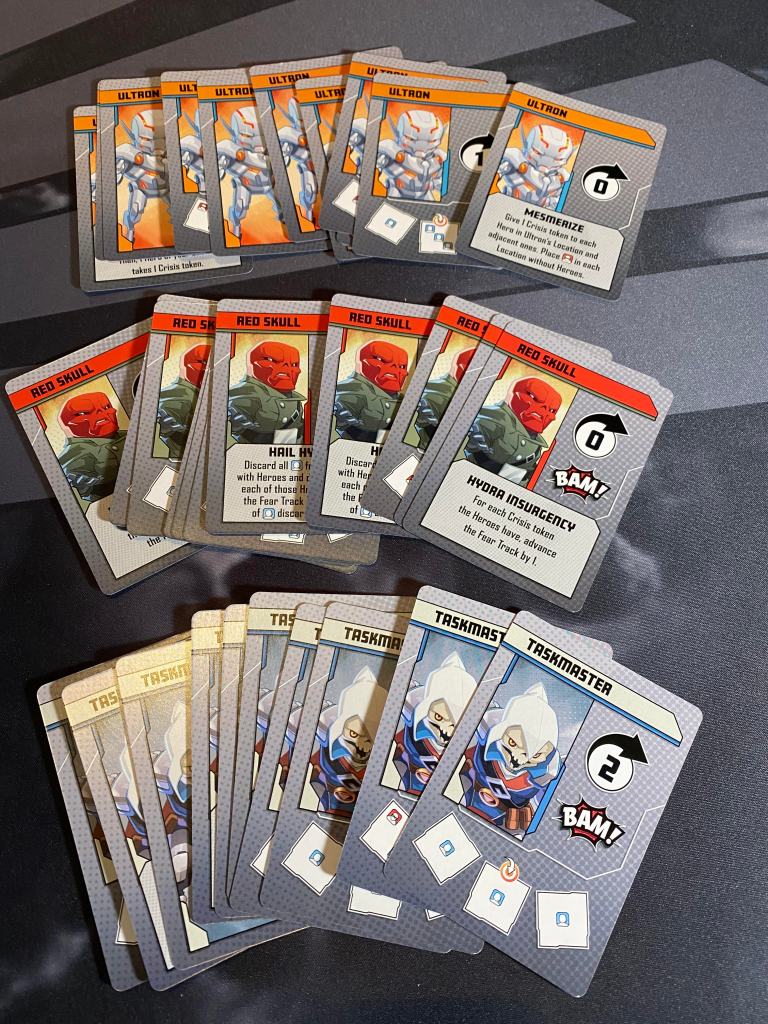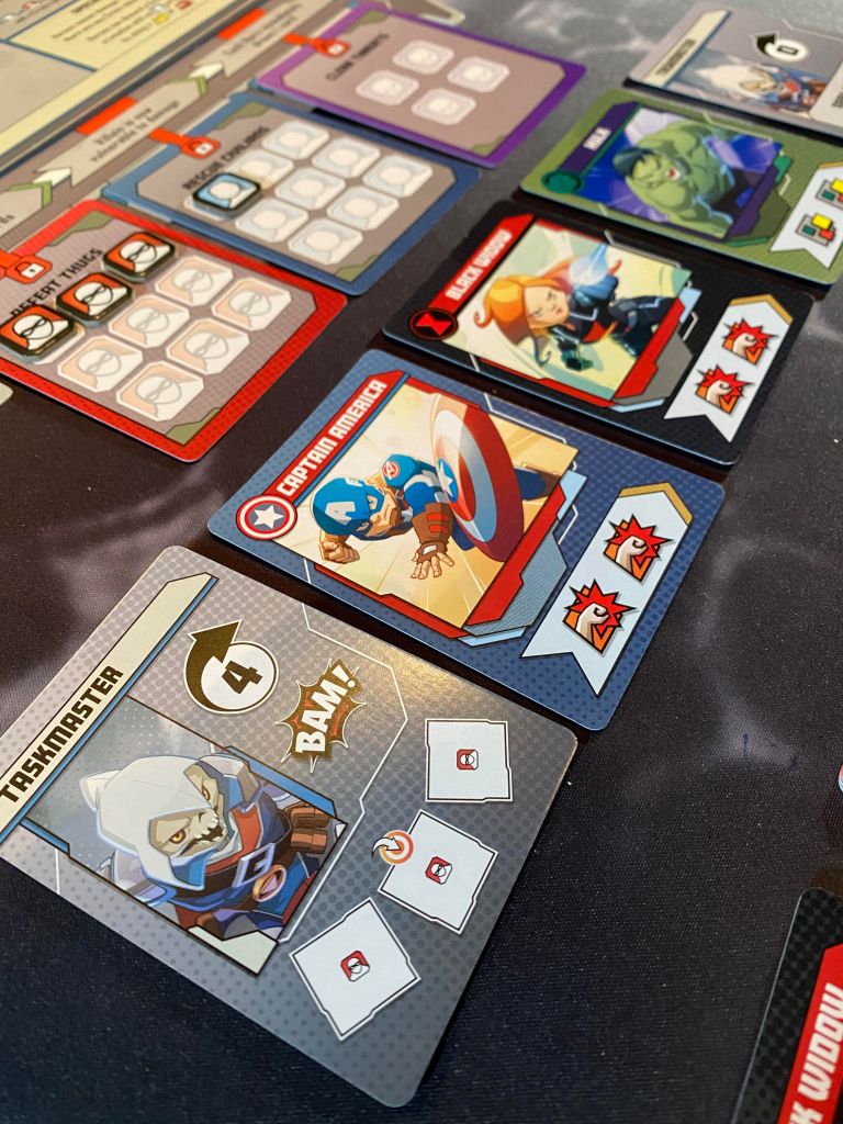 The game is a bit of a race as well. You have to defeat the villain before he runs out of cards in his master plan deck and before a player runs completely out of cards to play as well. This can get super tricky with some villains such as Taskmaster who slows you down at every opportunity. There are also other ways to lose the game as with Red Skulls fear track ever maxing out. That’s basically it, if you can work together to bring a villain down then you win!