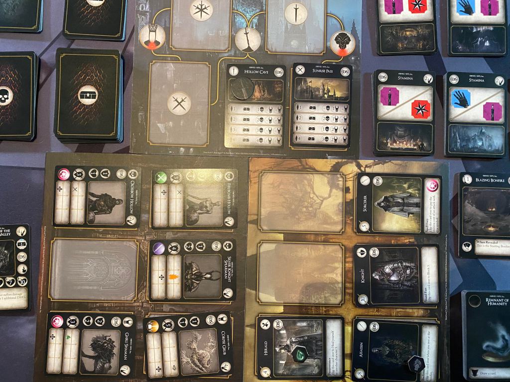 The general idea behind this game follows the videogames: engage enemies, collect souls/loot, rest at the bonfire to save, defeat the boss, repeat. To start off there are four playable characters in this game, you have the Knight, Assassin, Sorcerer and Herald. Each character has their own special starting deck that has specific cards that align with the class, kinda like how the Knight excels with shields and armor whereas the Sorcerer has spells he can cast. There are three boards that make up the game area, two of these boards are where you will place your character cards and the enemy cards respectively. The other is kind of a location map where you will travel to engage the enemies.