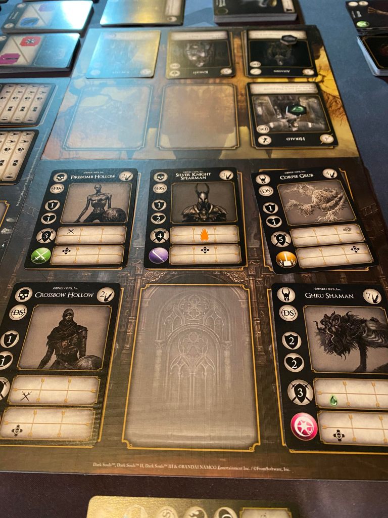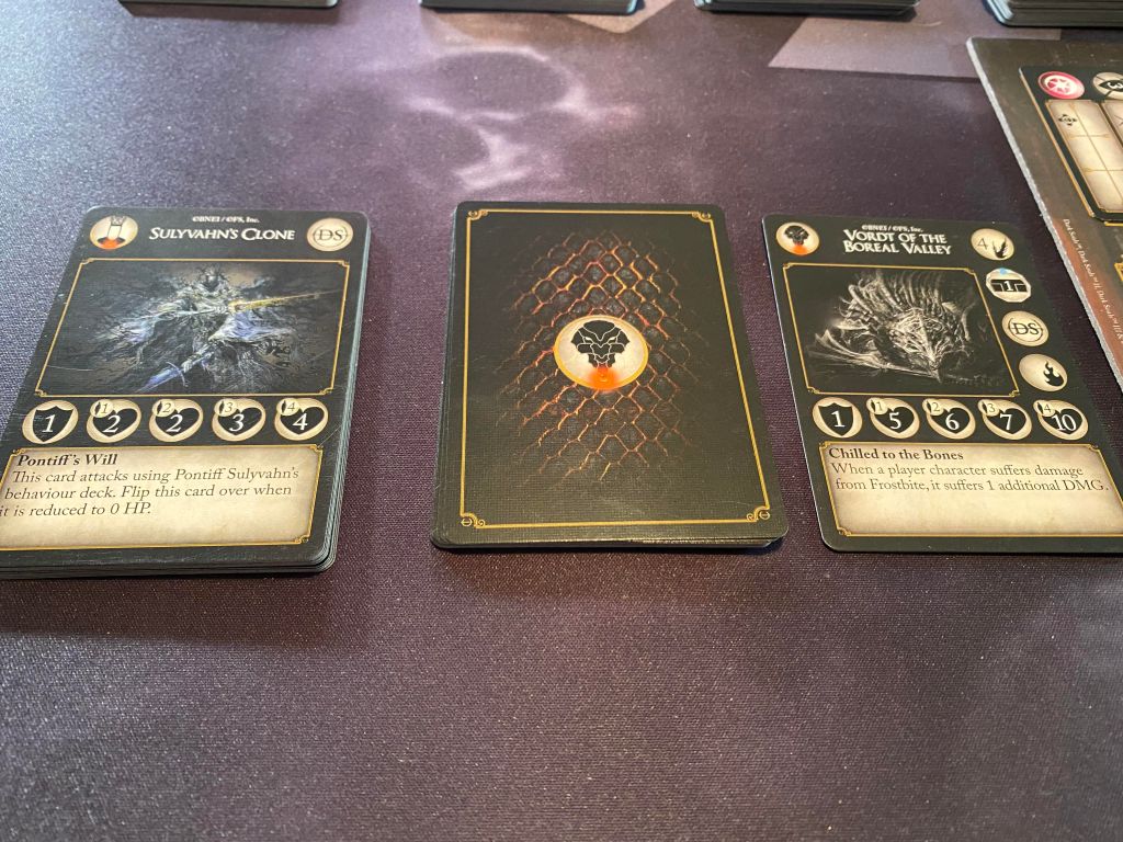 The basic gist is, continually stockpile collected gear and souls as long as you can, burning that bonfire down as much as possible until you feel you are ready to face the final boss. Once you feel you are sufficiently ready to face the boss you can move to one of the boss icons on either side of the location board to start that epic battle. The bosses work a tiny bit differently than the other enemies in that they each have their own respective deck of battle cards. Each boss activation you will draw from their deck that that will dictate their movement and attack. This is always changing so the bosses can be very unpredictable the first time you fight them. Of course once you go through all the cards in their deck you can kind of start to anticipate their actions to a small degree and act accordingly. Once you beat the boss, you and your party wins!