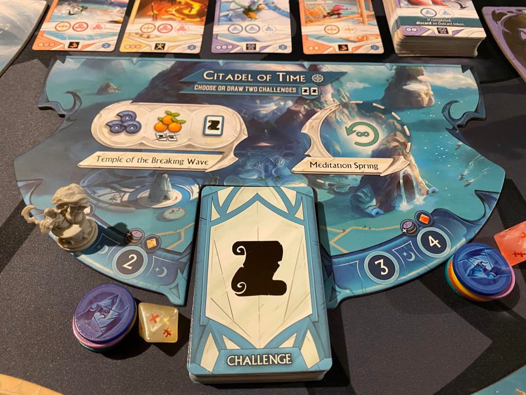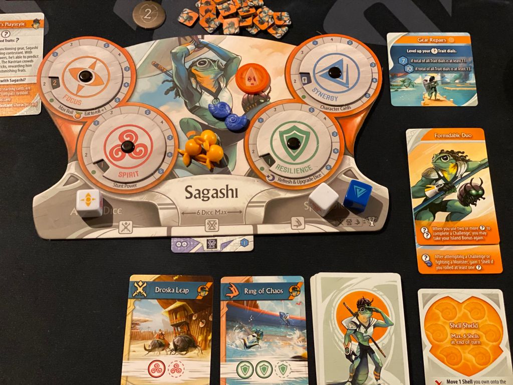 Let’s talk about the shell shields for a moment. Whenever you attempt a challenge or fight a monster you will choose how many dice (up to your “Focus” attribute level plus 1 for every fruit resource you pay) you will be rolling. Oh but that’s not all, you will also roll a damage die at the same time which determines how “injured” you can become during the attempts. Whenever that damage die rolls an X symbol you will need to place a shell token that you have acquired on your shell shield card. This card also allows special abilities based on how many shells there are on it, once you get to four shells you can remove those to change the face of any die rolled to whatever symbol you want. Once you get to six (the maximum you can have on the card) you can refresh your exhausted dice. That’s it! Therefore, you can keep rolling to your heart’s desire as long as you have shell tokens to spend. Once you complete or bail on a challenge or monster, you still get to increase your player ability trackers by the icon and amount you rolled. So, if you rolled 2 focus and 1 Spirit on the dice then you go up by those amounts on those particular player board trackers. However, if you can complete the challenges you also get to keep those cards for end game points AND for bonus dice used for fighting monsters as I mentioned earlier.