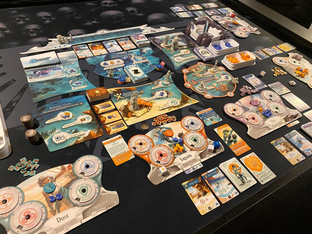 And finally my last questionable component choice actually pertains to the board itself, or should I say “boards”. The game board comes in many different pieces that need to be laid out in a particular way. This is 100% unnecessary and only goes to extend the game setup time as you need to reference the backs of each tile to know where they are placed (thank goodness they have that reference). To be honest I’ve sat here and thought about the purpose of this method of the board state and I came to the conclusion that they decided on breaking the board up into pieces for two reasons: Theme and Expandability. Yes, each tile represents a different island you can visit with each one pertaining to a different symbol for the challenges and yes with the tiles broken up its SUPER easy to add expansion tiles to make the board state larger (which they did with the 5th player expansion). BUT, I can’t help but sit here and imagine all these fiddly tiles on just one larger board with the card spaces outlined and the incredible artwork adorned all over to make it pop. Don’t get me wrong, I think the game looks incredibly impressive fully set up and at play. It has an amazing table presence but it’s also super fiddly and increases the setup time exponentially when compared to a single board.