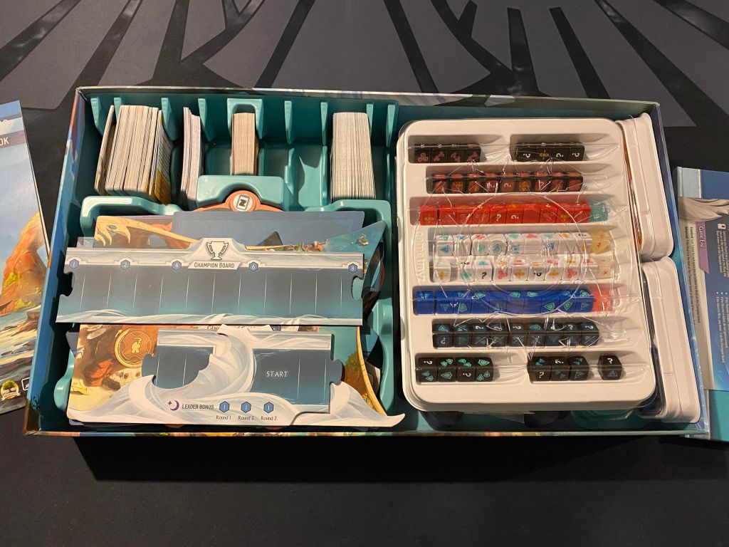 The box for the deluxe edition is SUPER long although relatively thin. But boy howdy are those some NICE GameTrayz located inside! For those that have read my other reviews I’m sure you’ve become accustomed to how I howl at the moon for a nice storage solution and, for me, Gametrayz are the king of storage solutions. Everything has a place in that box, even the plethora of dice has their own respective tray that not only keeps the dice organized by type, but can also be removed and sat on the table for ease of access when playing. There are a couple nice plastic trays for the shell and fruit tokens as well. Most of the rest of the storage solution is meant to keep the cards organized and the player tokens separate and steady when stored. HOWEVER, there is one aspect that this tray does fail, which is a rare occurrence for GameTrayz specifically, and it’s with those tiny fiddly player hit tokens again. There are just so many of these little cardboard beasts and the space to store them is FAR too small. It’s basically impossible to dig your finger into that space to get them out leaving you to have to just dump them out making a giant mess of mixed up tokens. On top of that storing them is almost a puzzle since they BARELY fit. Again, this is a rare thing for Gametrayz to fail on storage and even more interesting that they happen to fail on the most annoying component in the game, making that particular component MORE annoying.