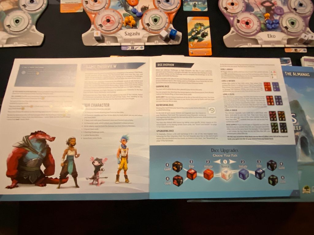 I’ll tell you I’ve had a ton of fun playing this one. I LOVE the amount of options you have at your disposal from all the different locations and variety of ways to achieve victory. Do you try to acquire more “Stunt” cards that give you all sorts of benefits based around your Spirit level? Do you run over to the market and spend your fruit to buy cards that also benefit you in some fashion or do you save your fruit for allowing you to roll more dice during challenges? The individual characters each have a 100% unique deck of upgrade cards that allow you to modify your character to your playstyle if you upgrade another one of your player board tracks. There are even unique starting score cards that kind of point you in a nice direction at the beginning to help you start working on something to gain more points for endgame.